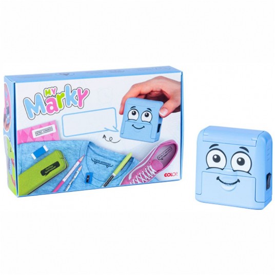Niebieska pieczątka COLOP My Marky to praktyczne i estetyczne narzędzie, które ułatwia organizację rzeczy osobistych dzieci i dorosłych.