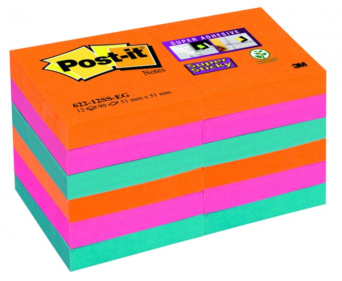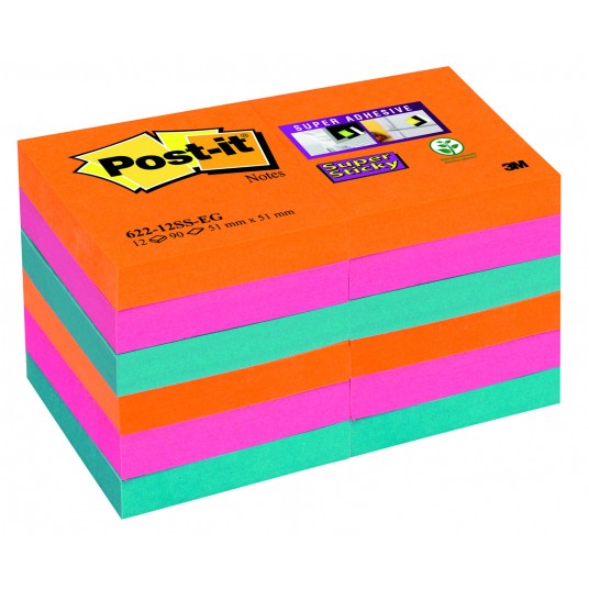 Bloczek samoprzylepny Post-it® super sticky (622-12ss-eg), 47,6x47,6mm, 12x90 kartek, paleta bangkok