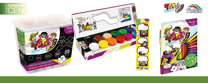 Bohaterowie kultowego komiksu Tytus, Romek i A'Tomek powracają w wyjątkowej kolekcji produktów Fiorello. Farby plakatowe, kreda chodnikowa i naklejki to propozycje, które pobudzą wyobraźnię, umilą czas i wprowadzą do codziennych zajęć szkolnych oraz domowych nutę zabawy i nostalgii.