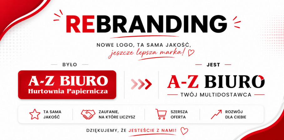 Rebranding to kolejny etap rozwoju A-Z BIURO – zwiększamy dostępność produktów, usprawniamy obsługę klientów i rozwijamy ofertę, zachowując najwyższą jakość oraz zaufanie.