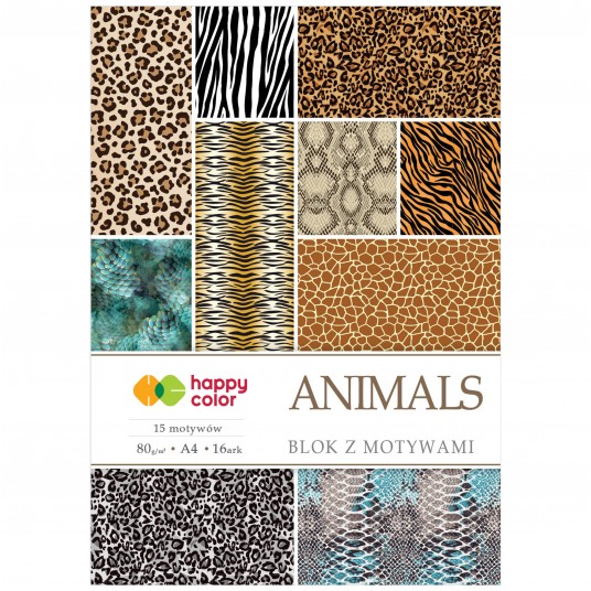 Blok z motywami animals, A4, 80g/m2, 16 arkuszy, 15 motywów, Happy Color