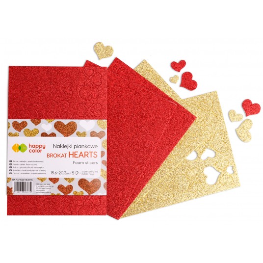 Naklejki serca brokatowe A5, 5 arkuszy, 3 czerwone/ 2 złote, Happy Color