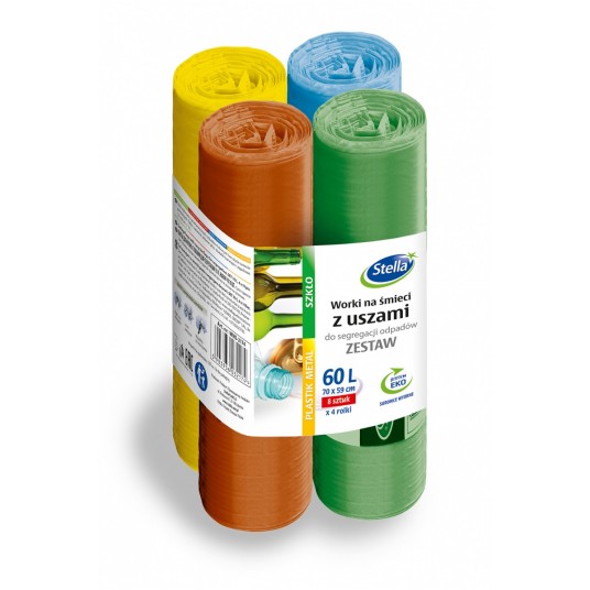 Worki z uszami Stella, do segregacji odpadów, zestaw, 60l, 4x8 szt., mix