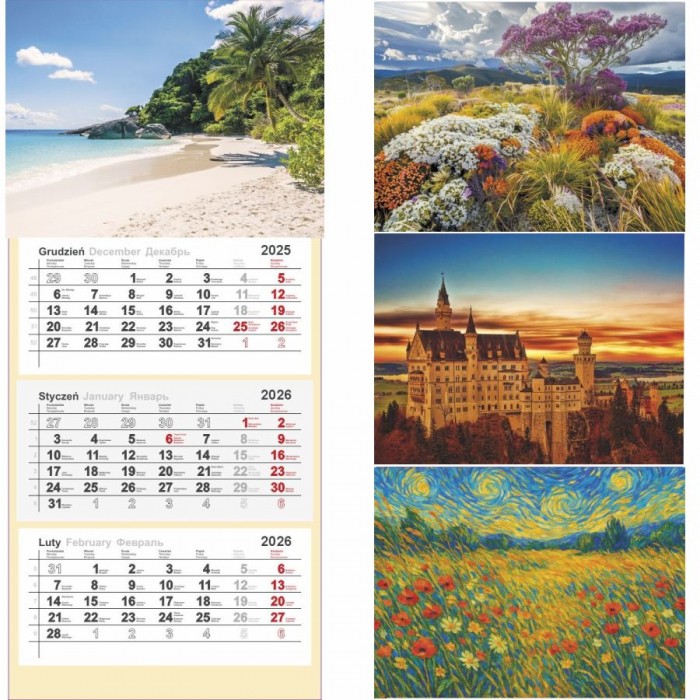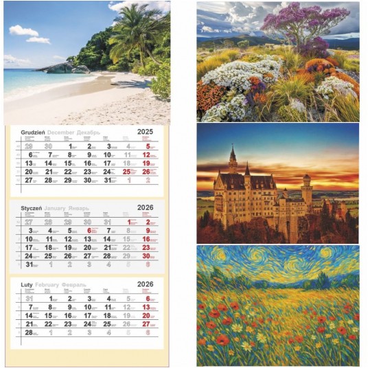 - Kalendarium: trzy odrębne kalendaria po 12 kartek, klejony