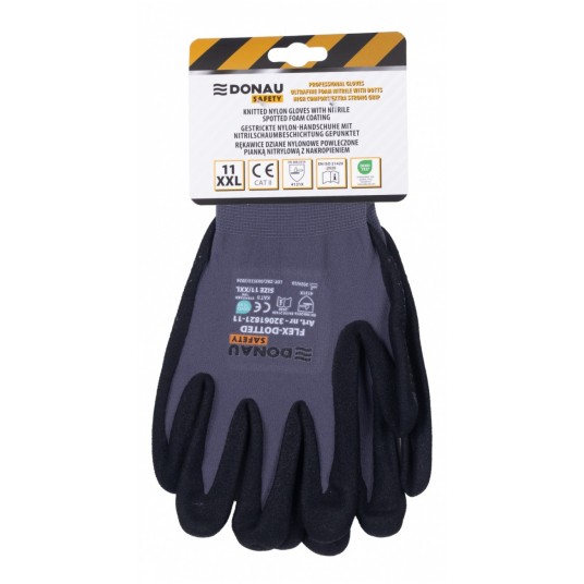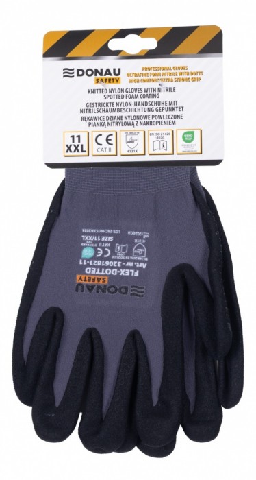 Rękawice DONAU Safety Flex Dotted w rozmiarze 11 to połączenie komfortu i niezawodności. Wykonane z elastycznej dzianiny nylonowej z dodatkiem elastanu i powleczone w części chwytnej ultradrobną pianką nitrylową z nakropieniem, oferują doskonały chwyt, wysoką odporność na ścieranie oraz ochronę mechaniczną. Znakomite dla profesjonalistów i pasjonatów majsterkowania ✅