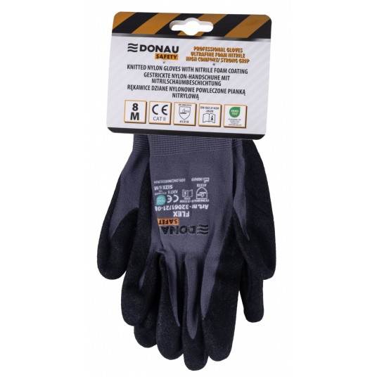 Rękawice DONAU Safety Flex rozm. 8 to niezawodne wsparcie przy pracach wymagających precyzji i ochrony dłoni. Wykonane z elastycznej dzianiny nylonowej z dodatkiem elastanu i pokryte czarną pianką nitrylową, gwarantują wysoki komfort noszenia, dużą manualność i wytrzymałość. Idealnie dopasowują się do dłoni, zapewniając bezpieczeństwo i wygodę nawet podczas długotrwałego użytkowania. ✅
