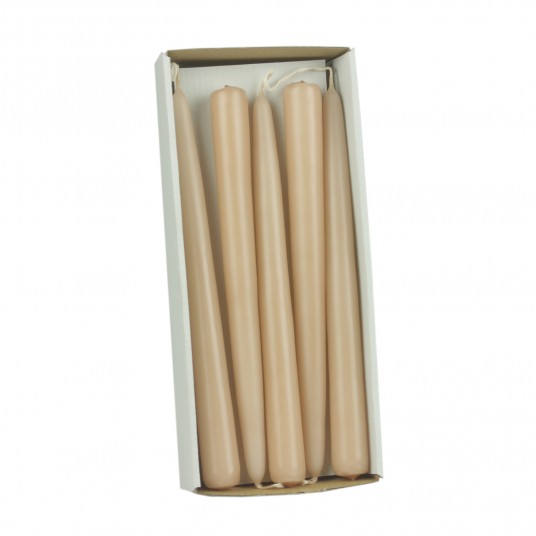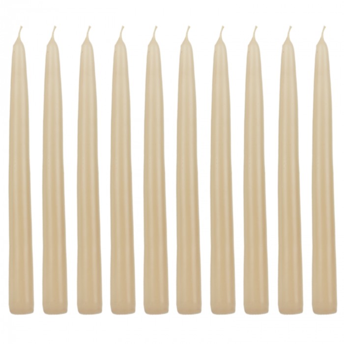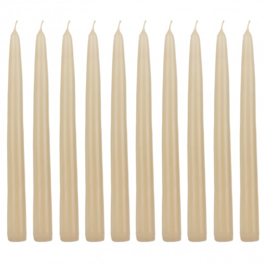 Zestaw 10 sztuk świec stożkowych o wysokości 24 cm w kolorze jasny beż to eleganckie rozwiązanie do dekoracji stołu, wnętrz i uroczystości. Świece wykonane są z wysokiej jakości parafiny, co zapewnia równomierne spalanie bez dymienia i kapania. Każda świeca pali się przez około 7 godzin, oferując ciepłe, stabilne światło na każdą okazję. Bezzapachowa formuła sprawia, że idealnie komponują się z każdym wnętrzem – zarówno w domu, jak i w miejscach publicznych.