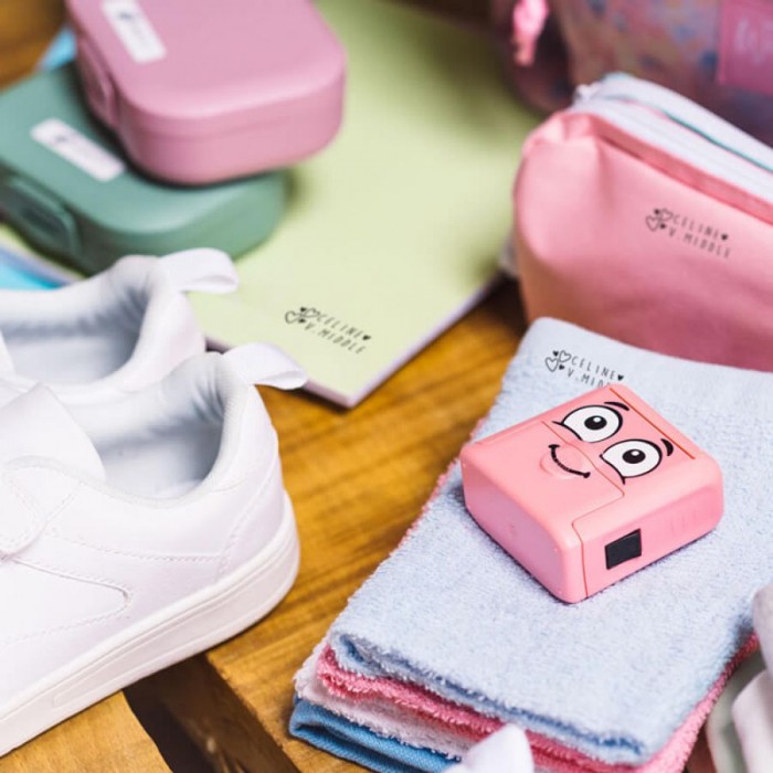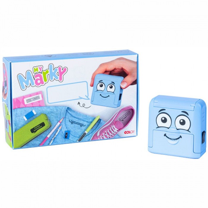 Niebieska pieczątka COLOP My Marky to praktyczne i estetyczne narzędzie, które ułatwia organizację rzeczy osobistych dzieci i dorosłych.