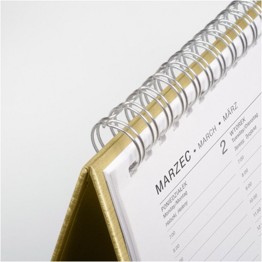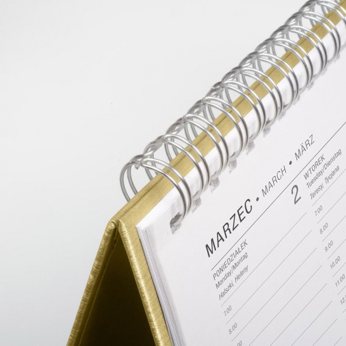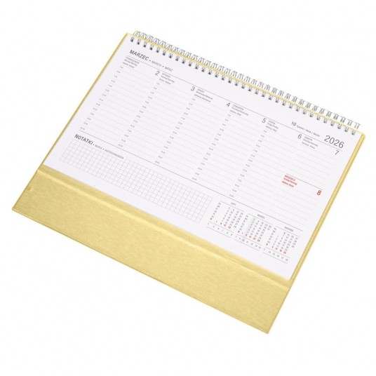 Elegancki kalendarz biurkowy A4 Fobos w kolorze złotym łączy przejrzysty układ z wygodą codziennego planowania. Na każdej rozkładówce widzisz poprzedni, bieżący i następny miesiąc, a tydzień na stronie z godzinami 7:00–20:00 pomaga uporządkować obowiązki. Plan roczny na okładce od spodu daje szybki ogląd całego roku, a dodatkowe miejsce na notatki ułatwia pracę. Idealny do biura, recepcji i domowego stanowiska pracy. ✅