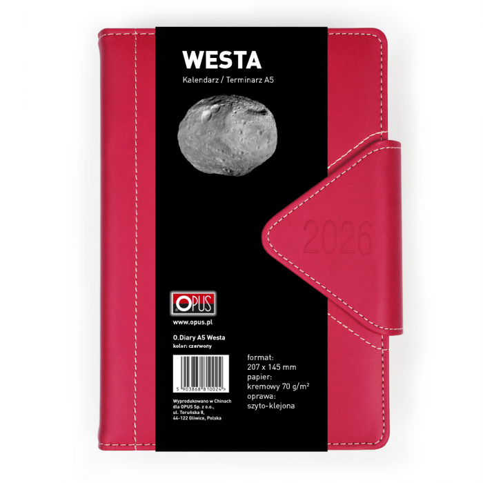 Kalendarz A5 dzienny Westa czerwony 2026 to idealne rozwiązanie dla osób ceniących funkcjonalność i elegancki wygląd. Intensywna czerwona okleina oraz możliwość grawerowania sprawiają, że to produkt praktyczny i stylowy zarazem.