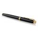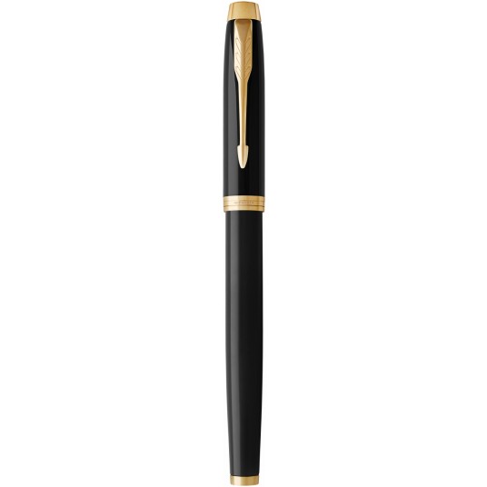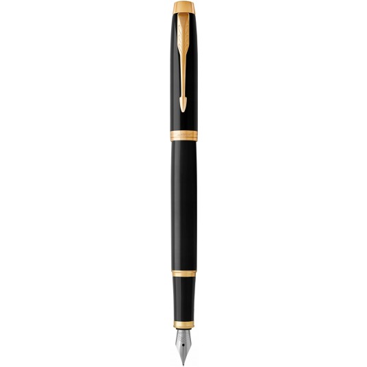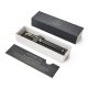 Na mosiężnej bazie położono kilkanaście warstw czarnego lakieru. Pierścienie chromowane i polerowane. Część przednia wykonana z połyskującego, czarnego tworzywa sztucznego. Pióro wieczne wyposażone jest w stalówkę z wysokiej jakości stali nierdzewnej typu F lub M. W piórze można korzystać z nabojów lub z tłoczka napełnianego atramentem (tłoczek nie dołączony). Idealne pióro wieczne Parker na prezent.