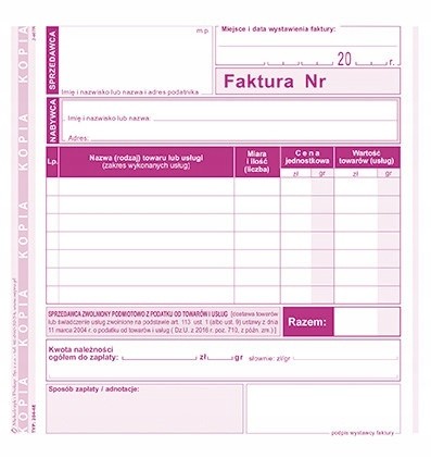 Druk faktura 2/3 A5 dla podatników zwolnionych podmiotowo z podatku od towaru i usług