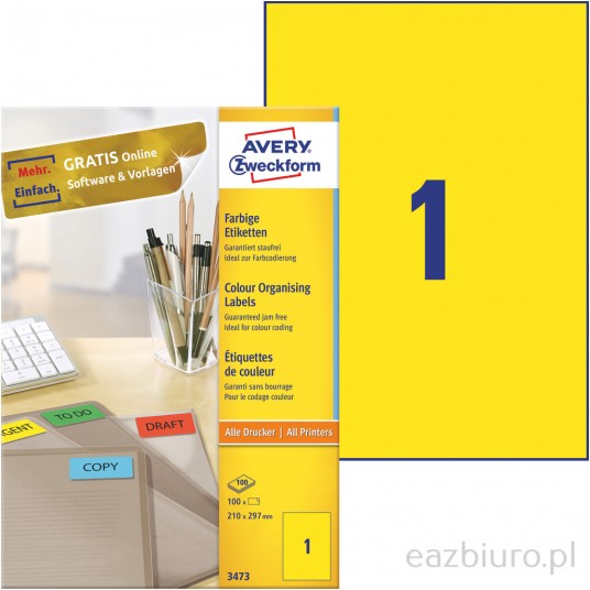 Etykiety trwałe kolorowe Avery Zweckform; A4, 100 ark./op., 210 x 297 mm, żółte
