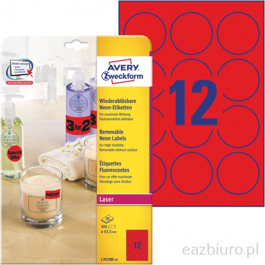 Usuwalne etykiety neonowe Avery Zweckform, A4, 25 ark./op., o63,5 mm, czerwone neonowe