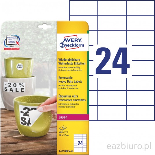 Etykiety heavy duty Avery Zweckform; A4, 20 ark./op., 70 x 37 mm, białe, poliestrowe -usuwalne