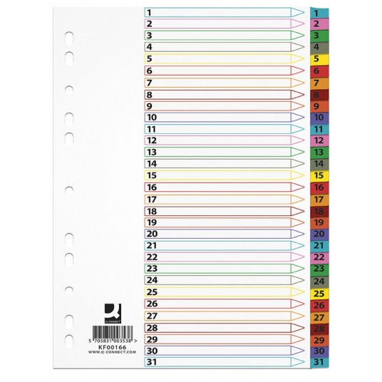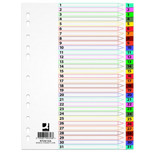 Przekładki Q-Connect mylar, kartonowe, A4, 225x297mm, 1-31, 31 kart, laminowany indeks, mix kolorów