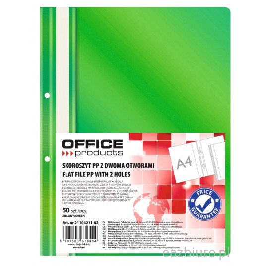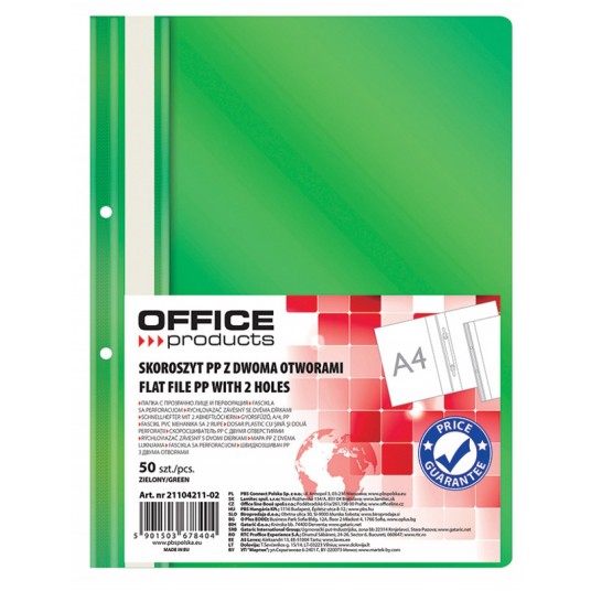 Skoroszyt Office Products, pp, A4, 2 otwory, 100/170mikr., wpinany, zielony