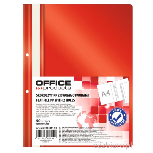 Skoroszyt Office Products, pp, A4, 2 otwory, 100/170mikr., wpinany, czerwony