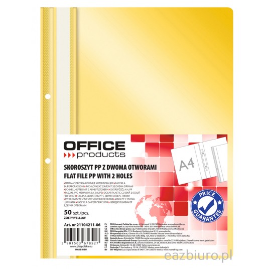 Skoroszyt Office Products, pp, A4, 2 otwory, 100/170mikr., wpinany, żółty