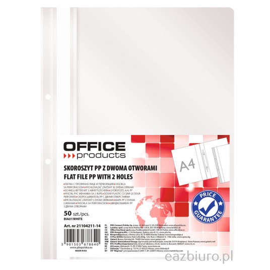Skoroszyt Office Products, pp, A4, 2 otwory, 100/170mikr., wpinany, biały