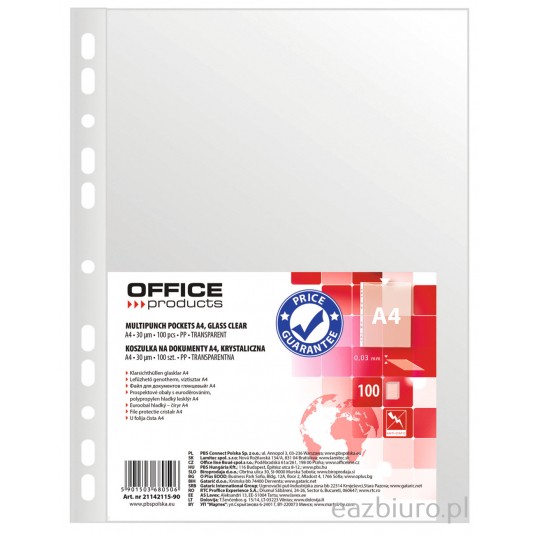 Koszulki na dokumenty Office Products, pp, A4, krystal, 30mikr., 100 sztuk