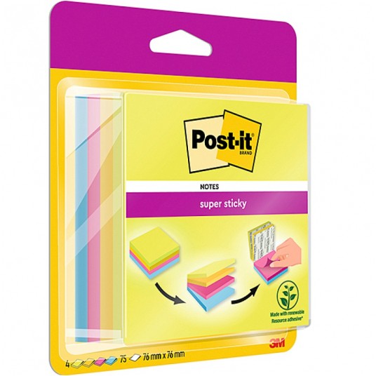 Multi-kostka samoprzylepna Post-it® super sticky (2014-sc-byfg),76x76mm, 4x75 kartek, mix kolorów