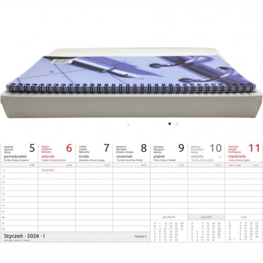 - Długość kalendarium: 296 mm, druk jednostronny, w dolnym rogu skrócony kalendarzyk trzech miesięcy