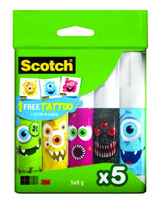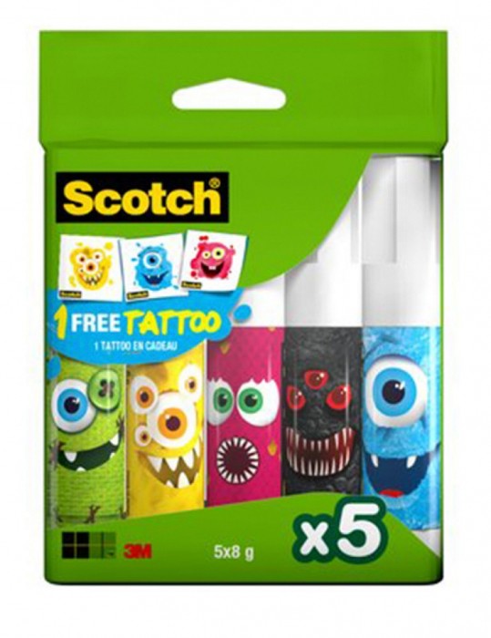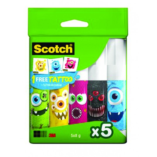 Klej szkolny w sztyfcie Scotch® monsters edition, do papieru, 8g, 5szt, bezbarwny