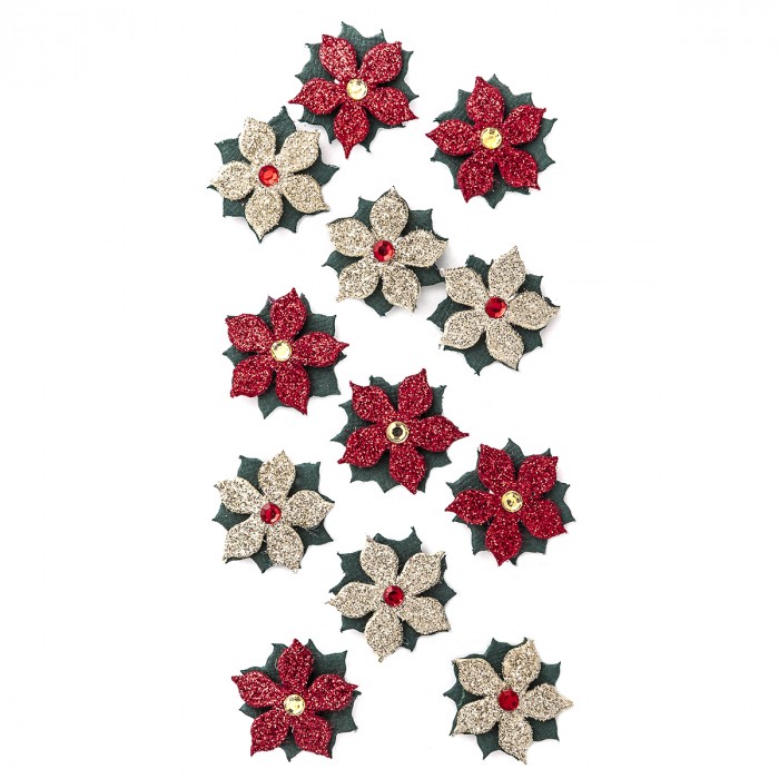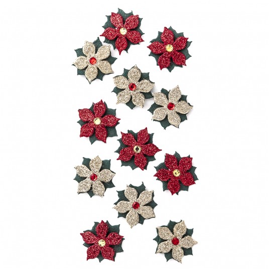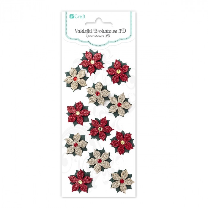 Naklejki brokatowe 3d - poinsecje , 12 szt. gold&red