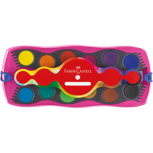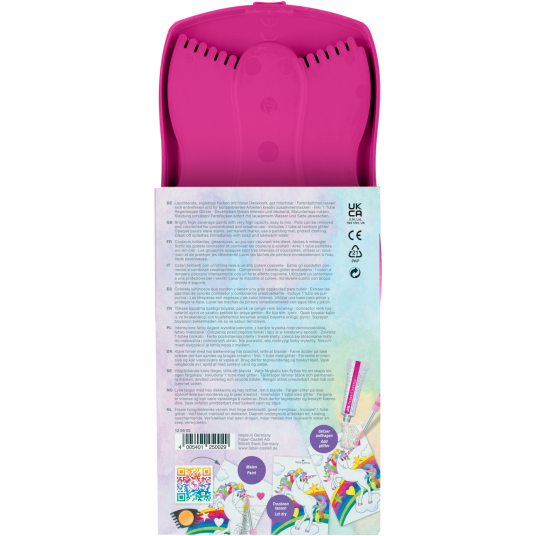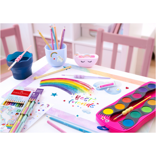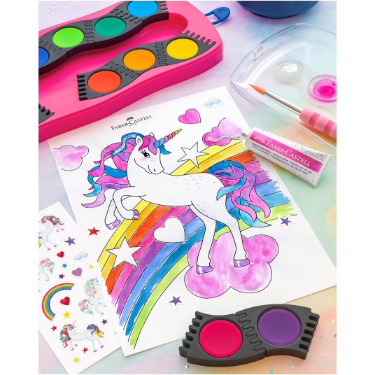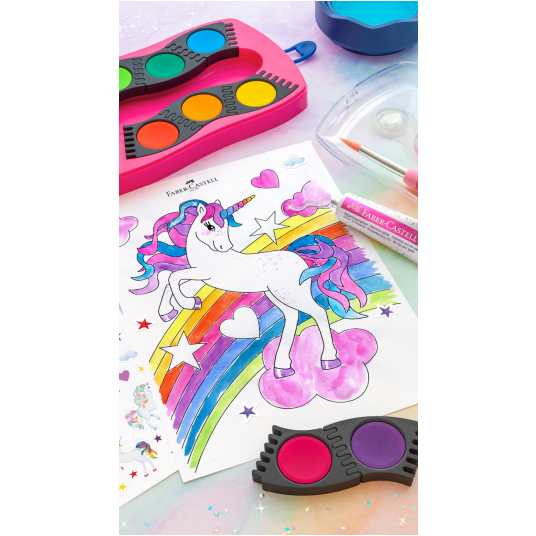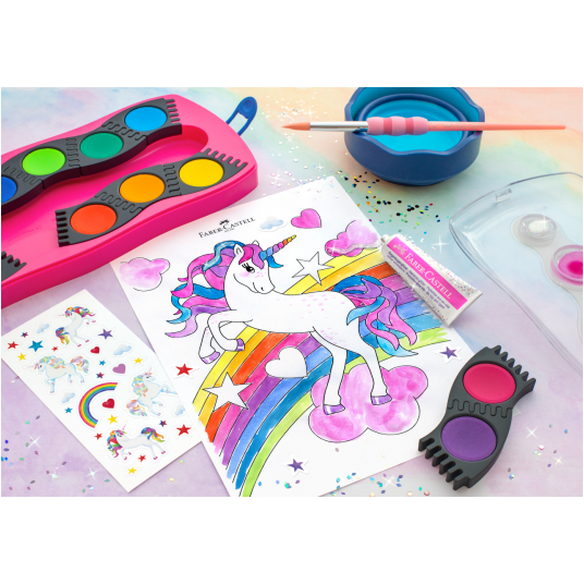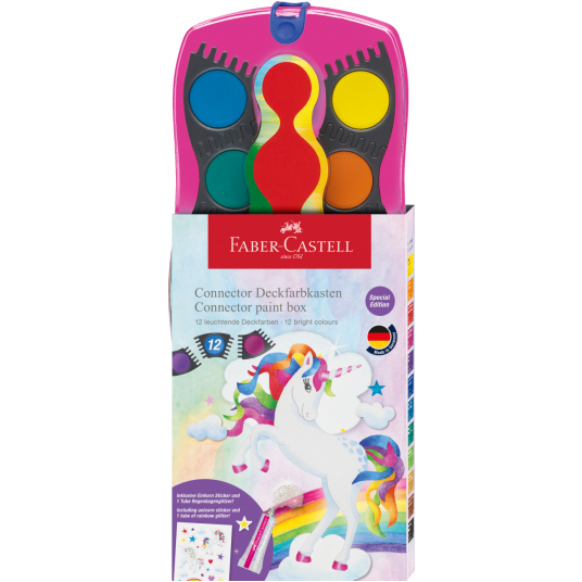Farby szkolne connector edycja unicorn 12 kol. + brokat w żelu + naklejki, różowa kasetka Faber-Castell